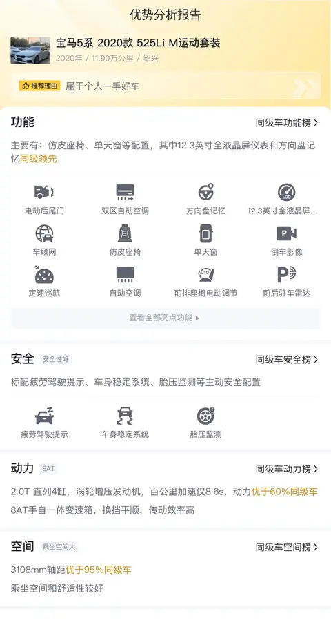 宝马5系2020款525Li M运动套装是一款集豪华、性能和科技于一身的中大型轿车。它在动力性能、操控性能以及科技配置和豪华感方面表现出色,能够为驾驶者和乘客提供优质的驾乘体验。尽管在内饰设计和保值率等方面可能存在一定的不足,但其出色的操控性能和丰富的科技配置使其在同级别车型中依然具有较高的竞争力。如果您注重驾驶乐趣和科技体验,那么这款车无疑是一个值得考虑的选择。但是,这款车也有其不足之处。例如,内饰设计相对简单,不如一些竞品豪华;保值率较低,可能会影响未来的车辆价值。此外,车辆还存在一些常见的通病,如电子设备偶发故障、烧机油等问题,这也需要潜在车主在购买前进行充分的了解和评估。综上所述,在考虑购买宝马5系2020款525Li M运动套装时,消费者应该根据自身的需求和预算做出合理的选择。如果您追求卓越的驾驶体验和先进的科技配置,并且能够接受其潜在的缺点和维修保养成本,那么这款车无疑是一个不错的选择。