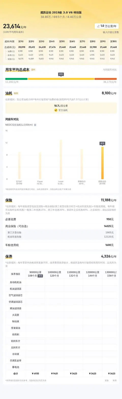 养车成本方面,该车官方公布的百公里油耗为10.7L,按每年行驶一万公里里程计算,燃油费用约为8837元,年度商业保险约11640元,每年保养费用约11640元,平均年度用车总成本约24181元,具体费用要看用车频率及使用环境而定。平台数据显示,该车用车成本在同类车型中,按用车成本从低到高排,处于52%的位置,养车成本适中。
