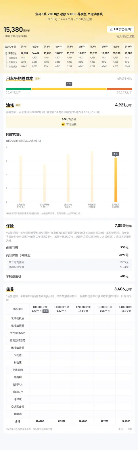 根据懂车帝的大数据分析,这辆宝马5系 2018款 改款 530Li 尊享型 M运动套装的10年平均用车成本约15185元/年,是一个比较合理的范围,毕竟百公里油耗6.5L,对于一辆豪华中大型车来说,是一个正常的水准。具体费用包括燃油费、保险费、保养费等。