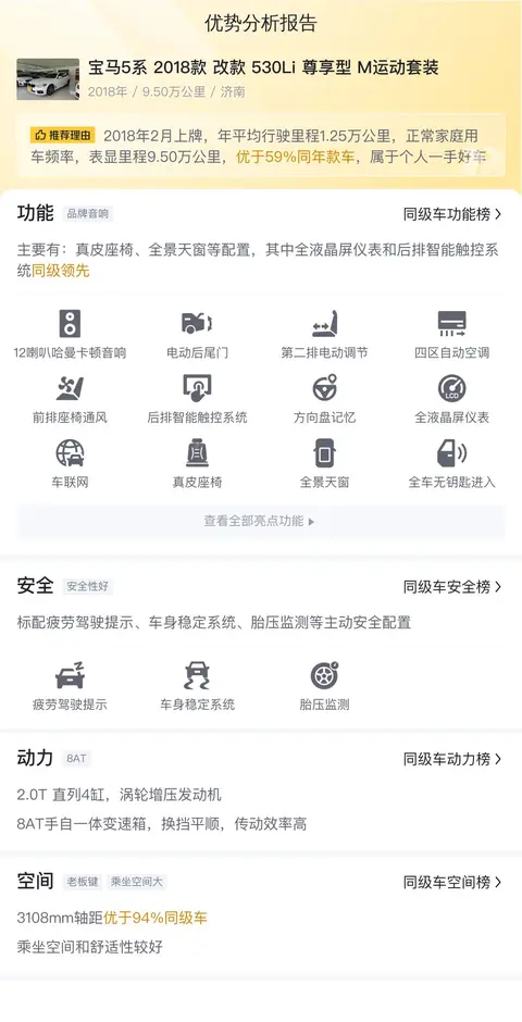 综上所述,这辆宝马5系 2018款 改款 530Li 尊享型 M运动套装的二手车报价是18.58万,该车在二手市场中属于合理价格,具有一定的性价比。这辆车品牌知名度高,外观漂亮,动力强劲,操控优秀,配置也比较丰富。不过也有一些常见的缺点,比如维修保养成本较高、燃油经济性一般、异响问题以及售后服务参差不齐等方面。至于如何选择,还是要看个人的需求和喜好了。