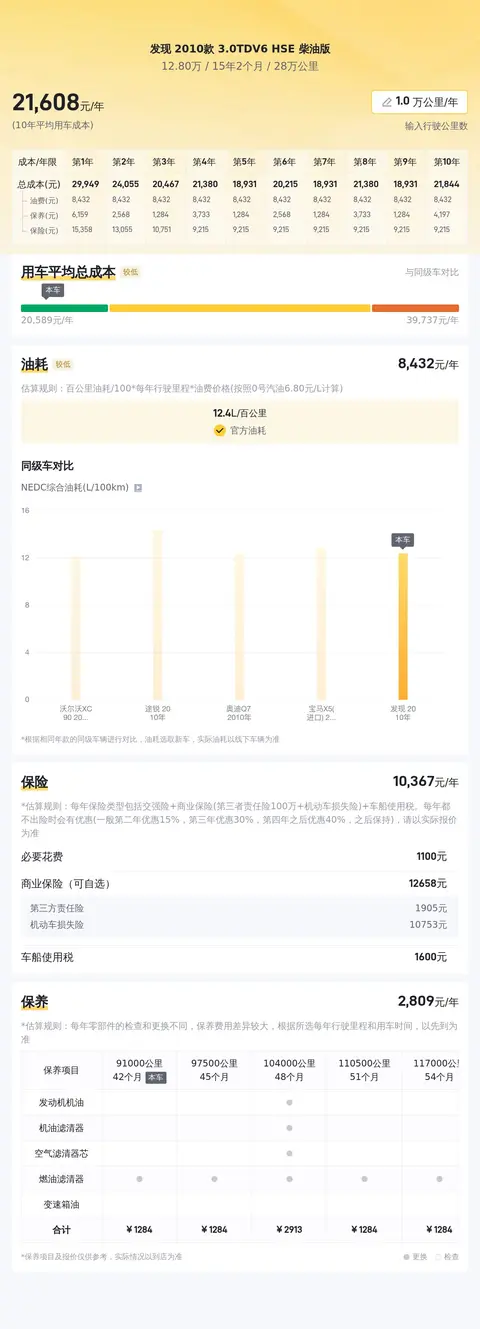 据估算,发现 2010款 3.0TDV6 HSE 柴油版的用车成本是22133元/年,同级车最低是19178元/年,最高是46726元/年,它的用车成本适中,整体开销不大。