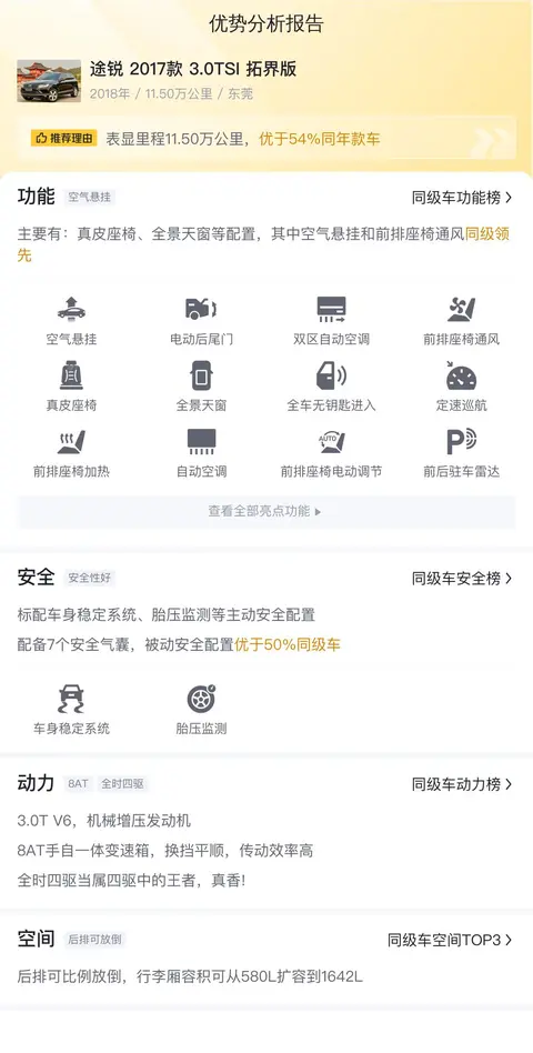 1. 动力强劲:3.0T V6,机械增压发动机,8AT手自一体变速箱,换挡平顺,传动效率高;