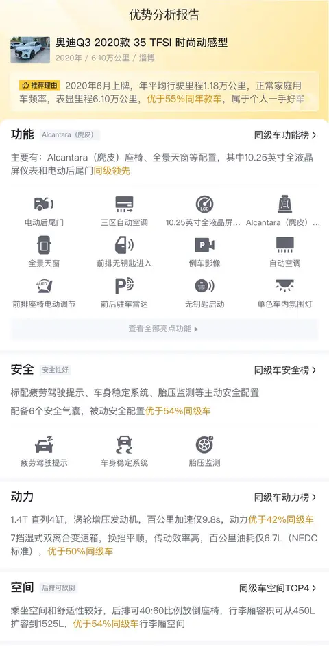 奥迪Q3自推出以来,便以其独特的品牌魅力、精湛的工艺质量和卓越的驾驶性能,赢得了消费者的广泛认可。它不仅体现了奥迪品牌的创新精神和追求极致的工匠精神,更在安全性、舒适性和科技感等方面表现出色。选择奥迪Q3,意味着选择了一种高品质的驾驶生活,一种对细节的执着追求,更是一种对生活的热爱和尊重。今天介绍的这辆二手奥迪Q3 2020款 35 TFSI 时尚动感型,综合表现优秀,且报价低于市场行情,是一个不错的选择。