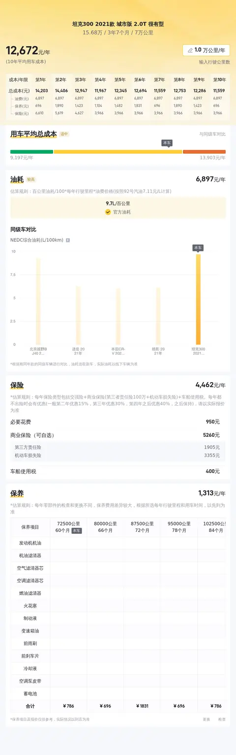 根据懂车帝平台的数据,目前的二手车市场行情显示,这款坦克300的二手车价位在13.68万至16.62万元之间。这里值得一提的是,价格因车辆的具体状况而异,包括车龄、行驶里程以及外观和内饰的保养情况等因素。实际成交价将根据车辆的实际情况进行调整。在购置二手车时,除了考虑购车成本外,还要合理预估日常使用和保养车辆所需的费用。基于懂车帝对这款车的分析,预计每年的用车成本大约在1.3万元左右,但这仍受多种变量影响,包括用车频率、行驶里程和个人驾驶习惯等。