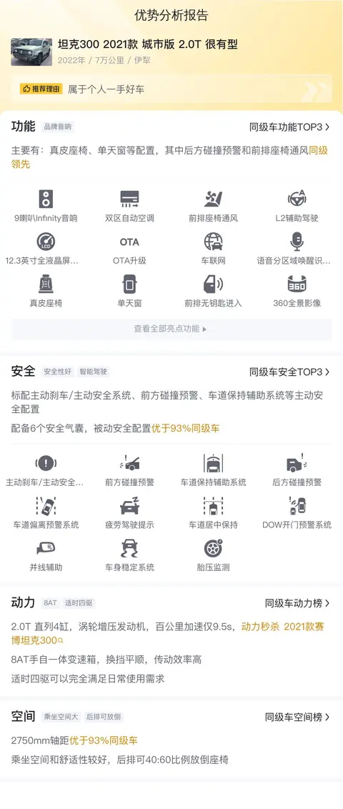 坦克300是一款具有强大越野性能、时尚外观设计和宽敞内部空间的硬派SUV。它搭载了2.0T发动机,提供了强劲的动力输出,在各种复杂路况下都能保持稳定的行驶性能。外观上采用了方正的车身线条、圆形前大灯和独特的前后杠设计,展现了硬朗而不失时尚的风格。内部空间宽敞,尤其是其2750mm的轴距在同级别车型中表现优秀,为乘客提供了舒适的乘坐体验。综合来说,坦克300 2021款城市版2.0T很有型是一款集越野性能、时尚外观和舒适空间于一体的硬派SUV,适合那些既追求驾驶乐趣又注重生活品质的消费者选择。