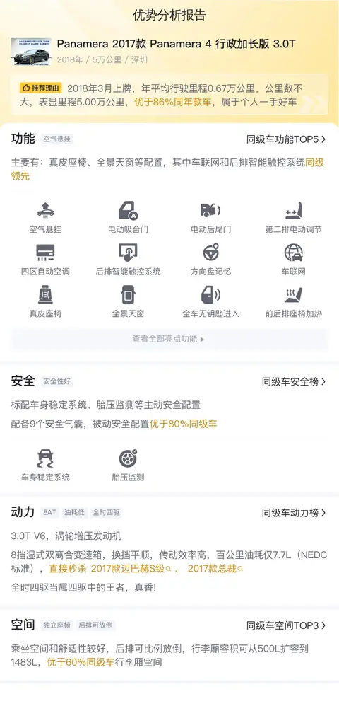 买二手车,配置信息也很重要,这辆Panamera 2017款 Panamera 4 行政加长版 3.0T配备了真皮座椅、全景天窗等配置,其中车联网和后排智能触控系统同级领先。在安全配置上,标配车道偏离预警系统、车身稳定系统、胎压监测等主动安全配置,配备7个安全气囊,被动安全配置优于80%同级车。
