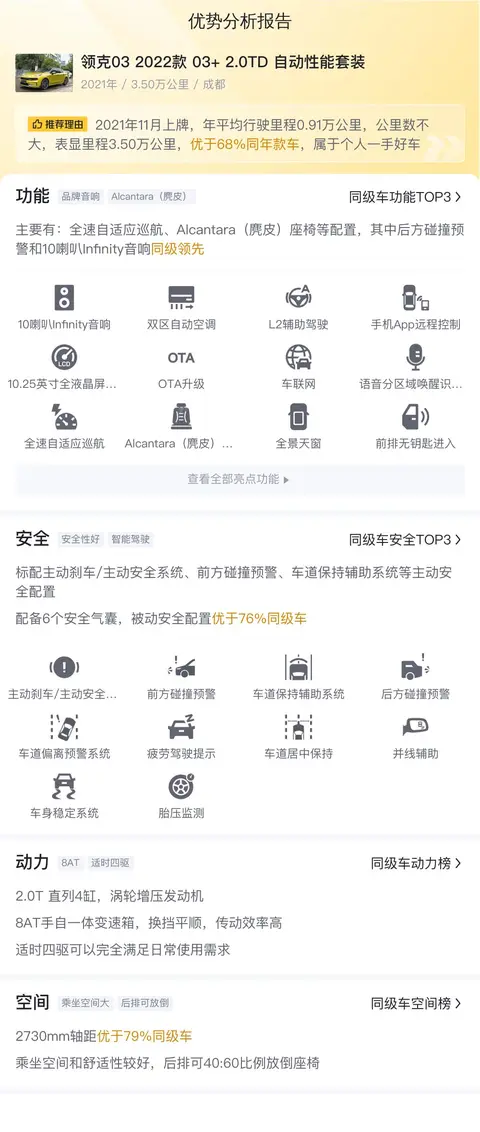 买二手车,配置要实用。领克03 2022款 03+ 2.0TD 自动性能套装配备了全速自适应巡航、Alcantara(麂皮)座椅等配置,其中后方碰撞预警和10喇叭Infinity音响同级领先。安全配置上,标配主动刹车/主动安全系统、前方碰撞预警、车道保持辅助系统等主动安全配置,配备6个安全气囊,被动安全配置优于63%同级车。
