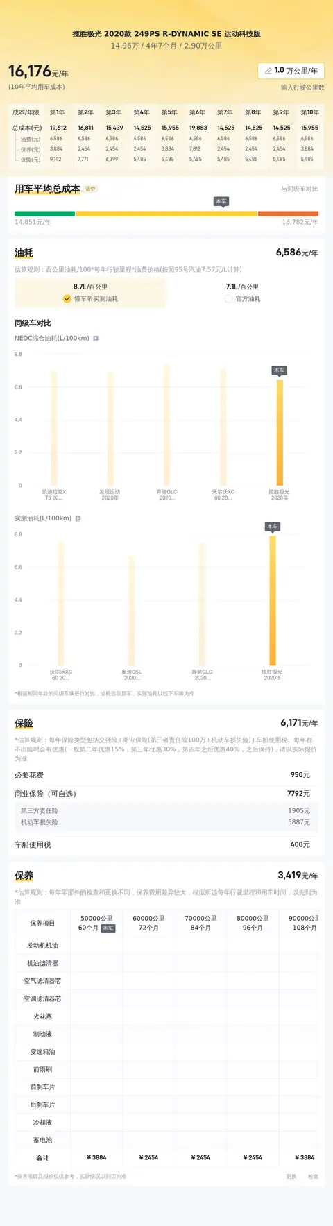 据估算,同级车的最低用车成本是13983元/年,最高是17766元/年,揽胜极光 2020款 249PS R-DYNAMIC SE 运动科技版是15681元/年,用车成本适中,不占优势。