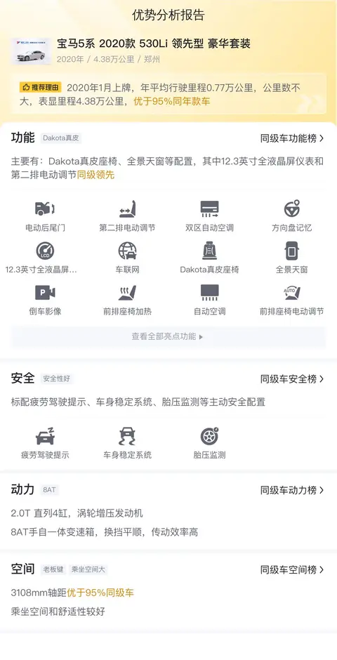 选购二手车时,除了车况本身,市场价格和用车成本也是不容忽视的重要因素。根据大数据分析,这辆宝马5系530Li的售价在二手车市场中处于较为合理的区间内。从经济角度来看,选择购买这辆二手车,相较于购买新车,无疑能够节省一大笔费用。在用车成本方面,按照每年 1.5 万元左右的估算,这一成本在同级别车型中属于合理范围。需要注意的是,实际成本可能会根据车辆的使用状况和个人驾驶习惯有所变动。此外,作为一款豪华车型,它还具备较高的保值率,这意味着在未来的几年内,即使再次出售,也能获得相对较高的回报。综合考虑,这辆行驶了 4.3 万公里的 2020 款宝马 5 系 530Li,以其卓越的车况、合理的售价和可控的用车成本,无疑是一个值得考虑的选择。