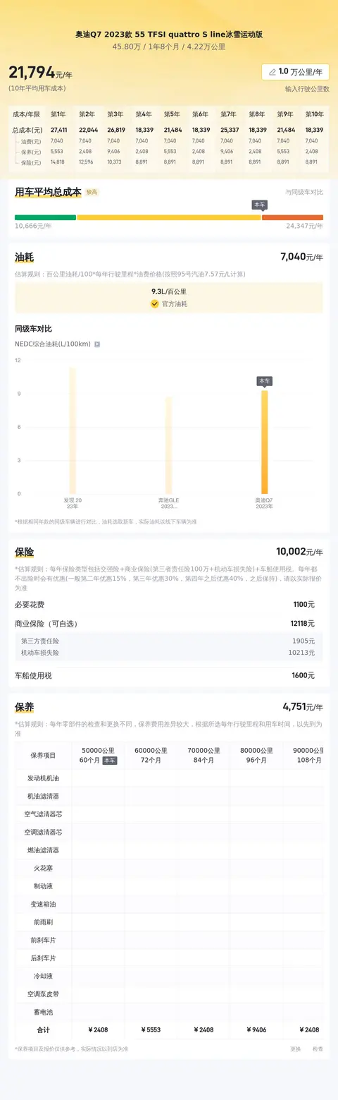 当前市场上,这款奥迪Q7的二手车行情较为平稳,根据车况和里程数等因素,其售价在42.2万至51.79万之间。具体售价因车而异,但总体来说,这辆奥迪Q7的售价在市场中具有一定的竞争力。在用车成本方面,按照每年2万公里的行驶里程计算,预计平均成本约为23468元,这一成本在同级别车型中属于合理范围。