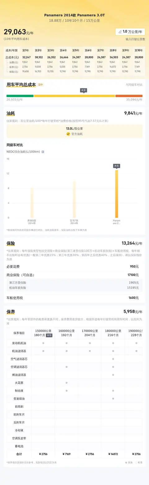 据估算,Panamera 2014款 Panamera 3.0T的用车成本是28604元/年,同级车最低是28604元/年,最高是47723元/年,所以用车成本偏低。