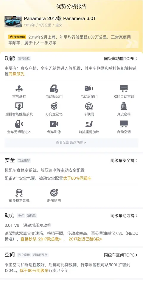 该车具体版本为——2017款Panamera 3.0T,上牌地为遵义,上牌日期2019年2月,表显里程9万公里,新车指导价97.30万,目前二手车报价53.78万,车身颜色白色,截至目前过户0次。支持分期购车,首付16.13万即可开回家。