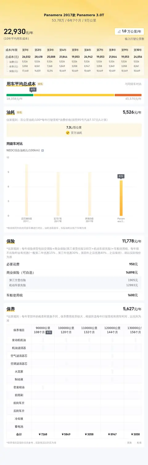 在二手车市场行情中,该车的售价在53.82-65.85万之间,具体售价因车况而有所不同。在用车成本方面,如上图所示,在百公里油耗7.3L的油耗水平下,该车的年均综合用车成本大概在2.3万元左右,具体费用根据车主的用车强度和环境等因素会有所差异。