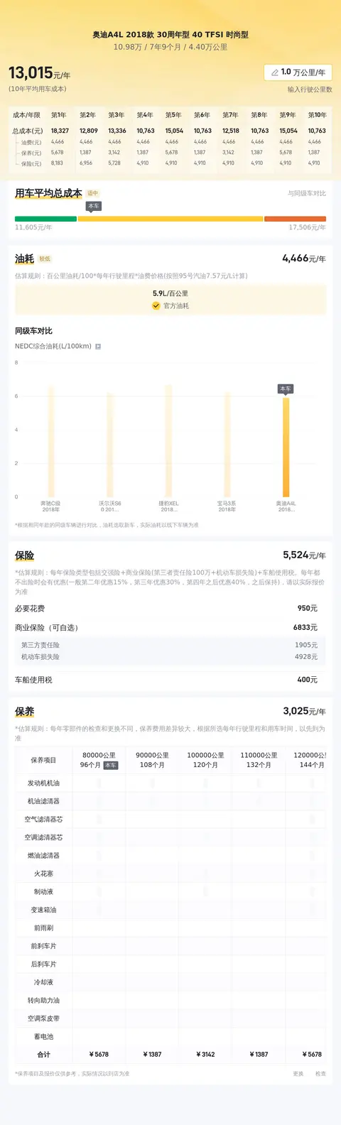 在不考虑其他费用大幅波动的情况下,根据懂车帝的估算,这款车型的 10 年平均用车成本大约在每年 1.2 万元左右。实际费用可能会根据车况、驾驶习惯、油价波动等因素有所变化。在购买二手车时,请务必考虑车辆的日常使用和保养成本,以免出现预算不足的情况。