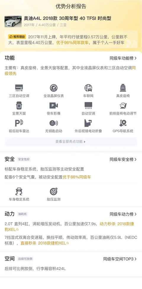 接下来,让我们认识一下今天的主角——一辆二手奥迪A4L 2018款 30周年型 40 TFSI 时尚型。这辆车来自美丽的三亚市,上牌日期为2017年11月,行驶里程为4.4万公里,车牌和车源地均在三亚,目前未有过户记录。车辆报价为10.98万元,比新车指导价节省23.31万元。