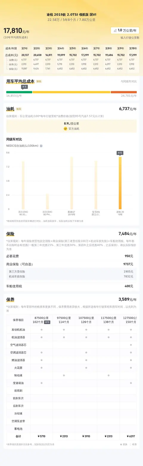 在购买二手车时,除了考虑车辆的售价外,还需要考虑到日常使用的成本。对于途锐2019款2.0TSI领航版国VI这款车来说,其10年平均用车成本为18,561元/年。这个成本包括了油费、保养费、保险费等日常用车所需的费用。其中,油费是日常用车成本中的重要组成部分。根据实际用户反馈和官方数据,途锐2019款2.0TSI领航版国VI的百公里综合油耗为8.9L。按照当前油价计算,每年的油费大约在15,025元/年。保养费也是日常用车成本中不可或缺的一部分。由于途锐是一款豪华SUV,其保养费用相对较高。根据实际用户反馈和官方推荐的保养项目,每年的保养费大约在3,304元/年。除了油费和保养费外,保险费也是日常用车成本中的重要组成部分。根据实际用户反馈和保险公司提供的数据,每年的保险费大约在5,132元/年。其他费用,如车船使用税、洗车费、过路费、停车费等,也需要考虑到日常用车成本中。根据实际用户反馈和预估,这些其他费用每年大约在1,100元/年。在购买途锐2019款2.0TSI领航版国VI二手车时,建议消费者不仅要考虑到车辆的售价,还要考虑到日常使用的成本。虽然这款车的车况良好、售价合理,但其日常用车成本相对较高,需要消费者有足够的经济实力来承担。