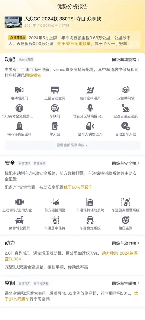 综上所述的新车含税价、用车成本、市场行情、优势分析、同款比价等数据仅供参考。在配置部分,因为二手车非标品,车辆可能会存在配置改装的情况,具体车况信息需要线下结合车辆实际情况进行综合参考。