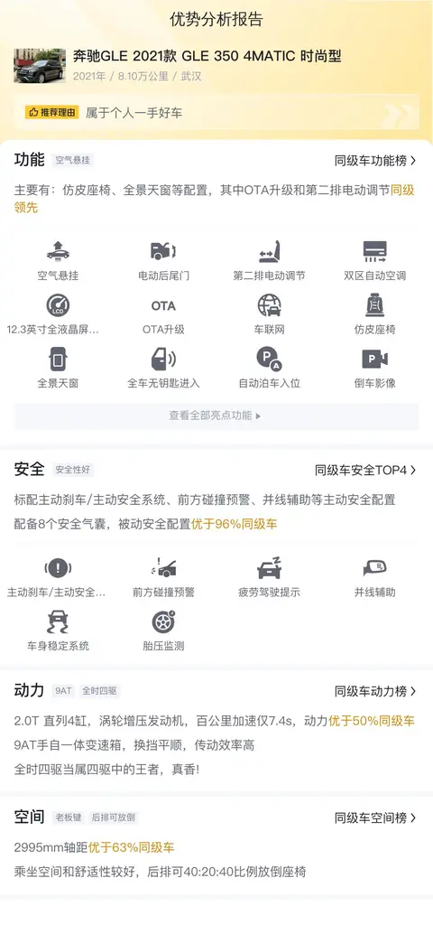 原本80多万的车,即便是二手的,配置也不会差。奔驰GLE 2021款 GLE 350 4MATIC 时尚型配备了360度全景影像、自动泊车入位、3种驾驶模式选择、64色车内氛围灯、全景天窗等配置。安全配置上,标配主动刹车/主动安全系统、前方碰撞预警、车道保持辅助系统等主动安全配置,配备8个安全气囊,被动安全配置优于88%同级车。