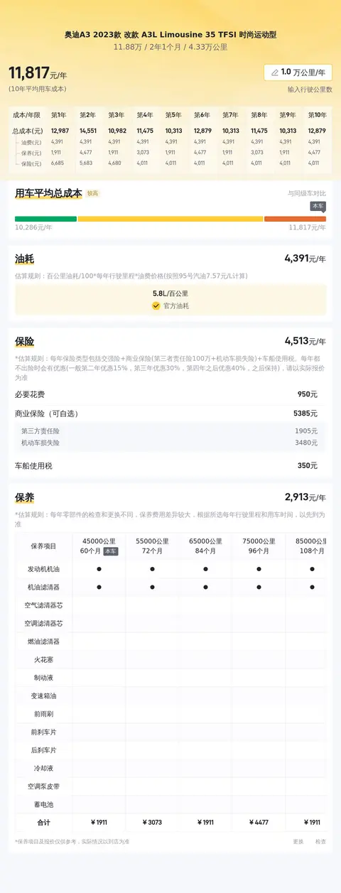 市场行情也是决定这款车价值的重要因素。目前,这款奥迪A3的二手车报价为11.88万元。关于用车成本,该车的官方百公里油耗为5.8升,按每年行驶一万公里计算,燃油费用约为4854元。保险费用预估每年约4388元,保养费用预估每年2638元,年均综合用车成本约11880元,当然具体金额还是要以实际使用为准。