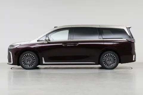 4、车身侧面:典型的MPV风格,线条非常平直,配备电动侧滑门和电吸门,车门处有镀铬饰条,提供全新样式的20英寸轮辋,强调空间实用性,镀铬装饰和新轮毂提升精致感与豪华感,电吸门提升使用便利性和高级感;