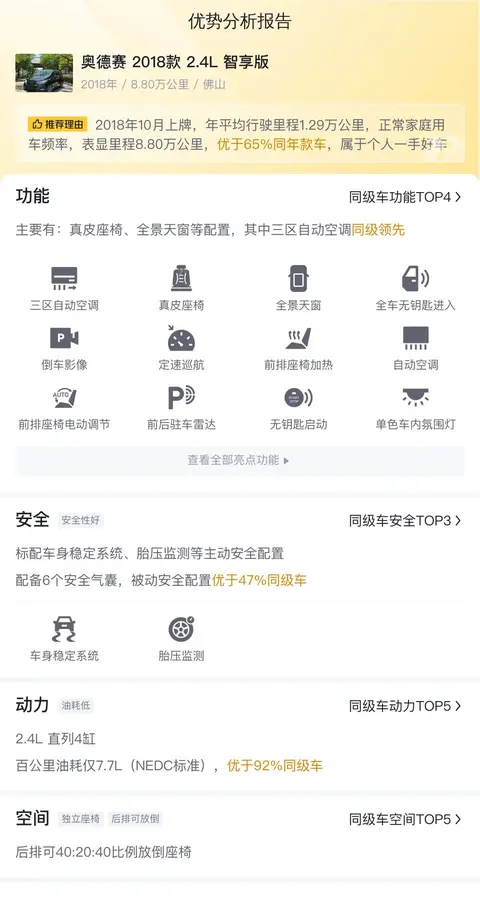 优势:奥德赛 2018款 2.4L 智享版的市场行情价是12.78万-15.93万,它的报价则是11.28万,报价低于市场行情价,过户0次,同时车龄还短于同级车,行驶里程也少于同级车,是一个不错的选择。空间宽敞,舒适性高,油耗也比较低,适合家用出行。
