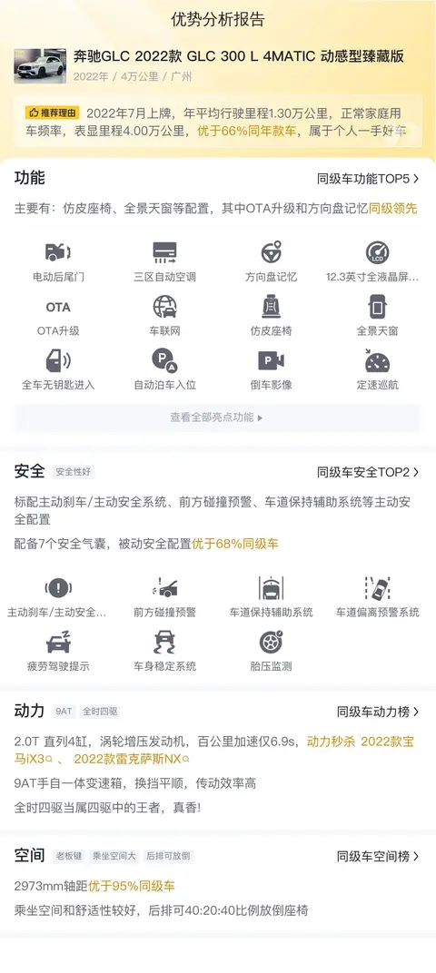 奔驰GLC(图片|配置|询价)自从在北京奔驰国产之后,就一直是国内豪华中型SUV市场的绝对标杆车型,虽然宝马X3和奥迪Q5L也是紧追不舍,但奔驰GLC一直保持着自己的节奏,稳扎稳打。今天要说这款奔驰GLC 2022款 GLC 300 L 4MATIC 动感型臻藏版,车龄小,正是最好的使用时期,总共行驶了4万公里,报价27万,属于比较低的价格了。