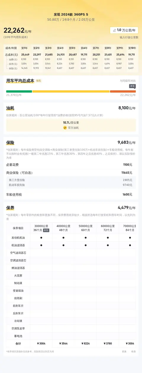 另外,同级车的最低10年平均用车成本是18033元/年,最高是26726元/年,而这辆 50:50的比例放倒座椅是22078元/年,适中的水准。