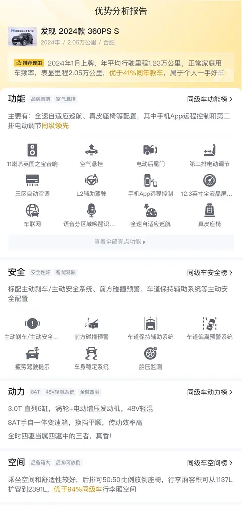 综上所述的新车含税价、用车成本、市场行情、优势分析、同款比价等数据仅供参考。在配置部分,因为二手车非标品,车辆可能会存在配置改装的情况,具体车况信息需要线下结合车辆实际情况进行综合参考。