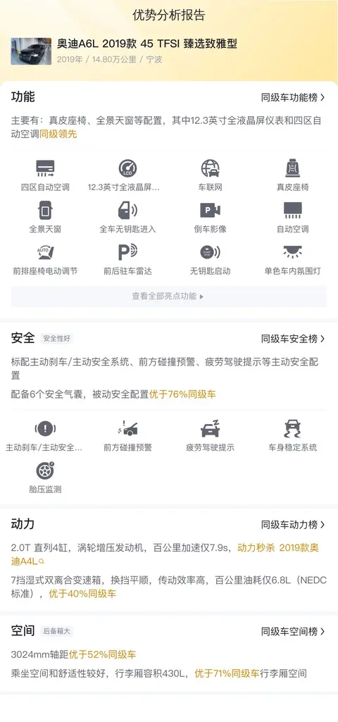 基于懂车帝大数据分析,与同级别车型相比,这辆奥迪A6L 2019款 45 TFSI 臻选致雅型在以下几个方面具有较为明显的优势: