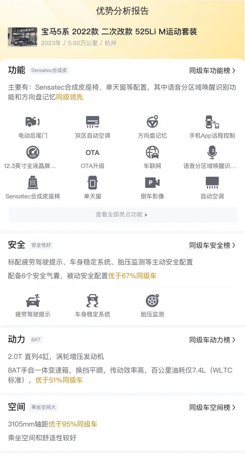 作为一款豪华轿车,这辆车的整体配置还是不错的。该车采用2.0T直列4缸,涡轮增压发动机,匹配8AT手自一体变速箱,换挡平顺,传动效率高,百公里油耗仅7.4L,优于51%同级车。此外,3105mm轴距优于95%同级车,乘坐空间和舒适性较好。座椅材质为Sensatec合成皮,易于打理且观感上乘,单天窗虽未达到同级最佳,但也属合理配置。值得一提的是,该车的方向盘记忆和语音分区域唤醒识别功能同级领先,提升了驾驶的个性化体验。