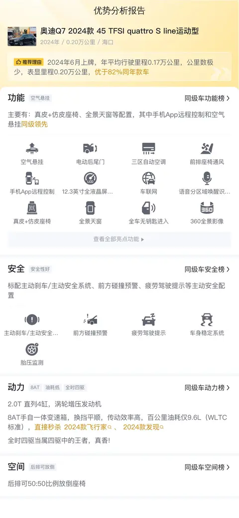 综上所述的用车成本、市场行情、优势分析、同款比价等数据仅供参考,车况信息需要线下结合车辆实际情况进行综合参考。一辆车的车况如何,决定了它的实际价值。这辆开了2万公里的奥迪Q7 2024款 45 TFSI quattro S line运动型,只要46.8万,这个价格香不香,还得您自己来定!