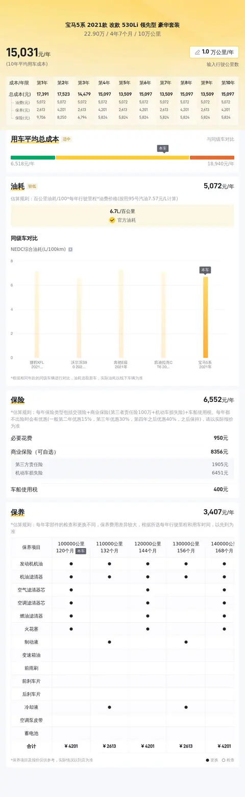 关于用车成本,这辆车的官方百公里油耗为6.7L,按每年行驶一万公里里程计算,燃油费用约为5657元,这辆车的年保险费用大约为5485元,年保养费用估计为4153元,因此,平均每年的用车总成本大约为15295元,以上只是参考值,实际用车成本受多种因素影响会有所区别。