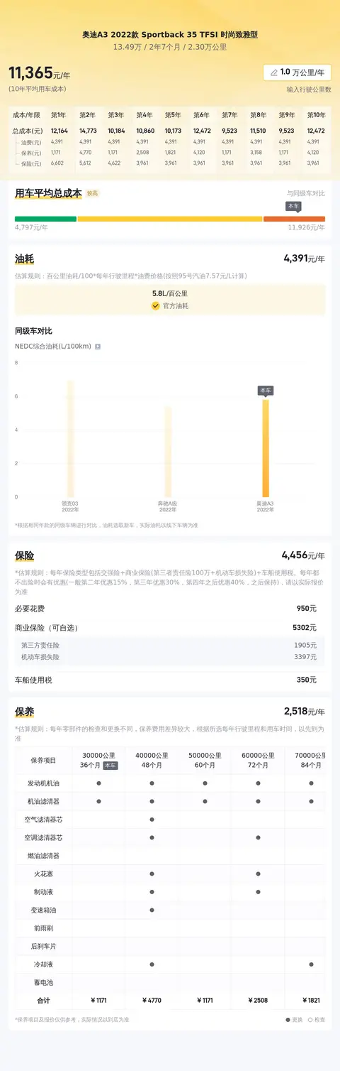 选购二手车,不仅要考虑买车费用,也要考虑用车费用,以及未来可能的卖车费用。根据懂车帝对这辆车的分析,这辆车10年平均用车成本大概是11347元/年,保值率大概是43.97%,属于挺高的水准了。