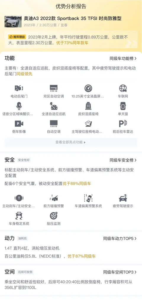 先来看看这辆二手奥迪A3的基本情况,新车于2023年2月在宜春上牌,目前跑了2.3万公里,有过一次过户记录,外观为白色,符合国VI排放标准。从里程数来看,这辆车用得不多,从上牌时间来看,算是准新车了,再考虑到只要13.49万的价格,还是很有吸引力的。