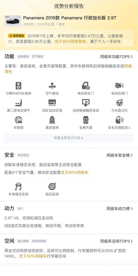 这辆Panamera 2019款 Panamera 行政加长版 2.9T,上牌地为江苏南京,上牌日期2019年7月,表显里程2.9万公里,新车指导价113.8万,二手车报价68.8万,过户次数0次。车辆能源类型为汽油,排放标准国VI,黑色车身浅色内饰,后驱驱动方式,8挡双离合变速箱,座椅材质为真皮,天窗类型为分段式可开启全景天窗。车源地为南京,车身尺寸5199x1937x1428(mm),轴距3100(mm),行李舱容积500-1490L,前排座椅支持的功能有前排座椅记忆,多媒体接口为USB/Type-C,亮点配置有全车支持无钥匙进入,方向盘记忆,单色车内氛围灯,电动后尾门,电动吸合门,前排座椅加热,第二排电动调节,第二排座椅加热,自动大灯,大灯随动转向,自适应远近光,外后视镜电动折叠,内后视镜防眩目,雨量感应式雨刷。