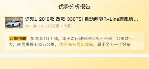 今天介绍的这辆2019款途观L 330TSI 自动两驱R-Line旗舰版符合国六排放标准,2020年1月首次上牌,目前行驶里程为4.3万公里,一次也没过户,属于一手车源。外观为白色,内饰为深色,车辆所在地和上牌地均为太原。这辆车的新车指导价为26.98万元,目前二手车报价为12.58万元,相比新车价格便宜了14.4万元。