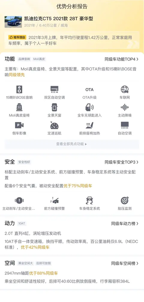 综上所述,这辆二手凯迪拉克CT5 2021款 28T 豪华型在车况、配置、安全、动力性能、驾乘感受与空间等方面均表现出色。尤其是其较低的售价和首付金额,为有意购买豪华轿车的消费者提供了一个经济实惠的选择。然而,由于该车目前未提供第三方权威检测报告,潜在买家在做出购买决策之前,建议进行实地考察和试驾,以确保车辆状况符合个人期望和需求。