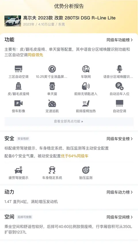 最后,我们再来看看这款车在懂车帝平台上的综合表现如何,您可以从安全性、动力、空间、操控以及舒适性等维度与同级别车型做个对比,这样也能更让您全面的了解这款车的产品力怎么样。