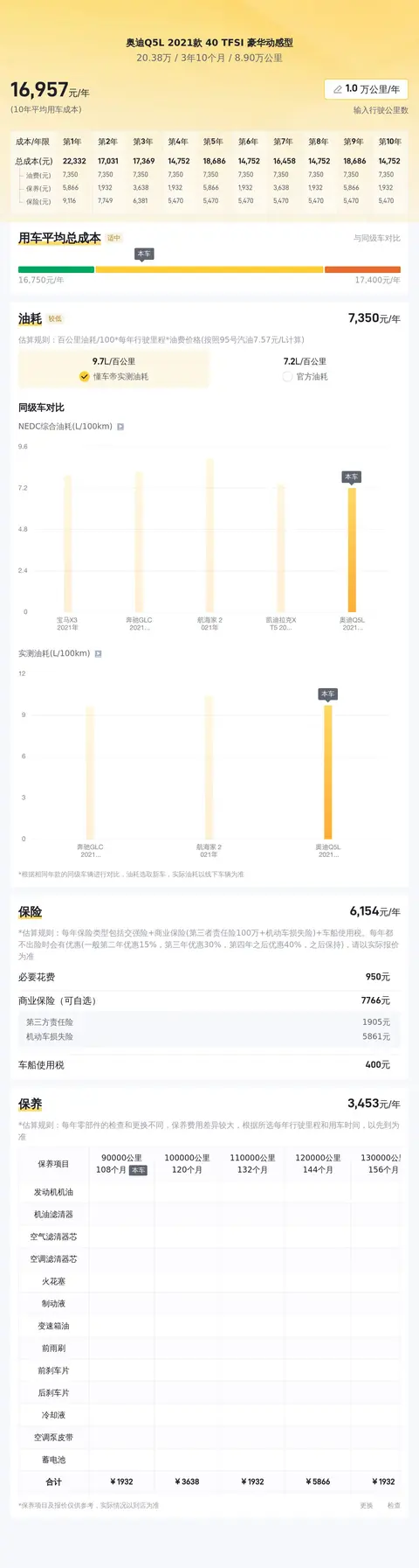 养车成本方面,这辆车年度商业保险约6181元,每年保养费用约4137元,不计算燃油费的平均年度用车总成本约10318元。全国同级车养车成本最低9556元,最高13536元,这辆车养车成本在同级别车型里适中。