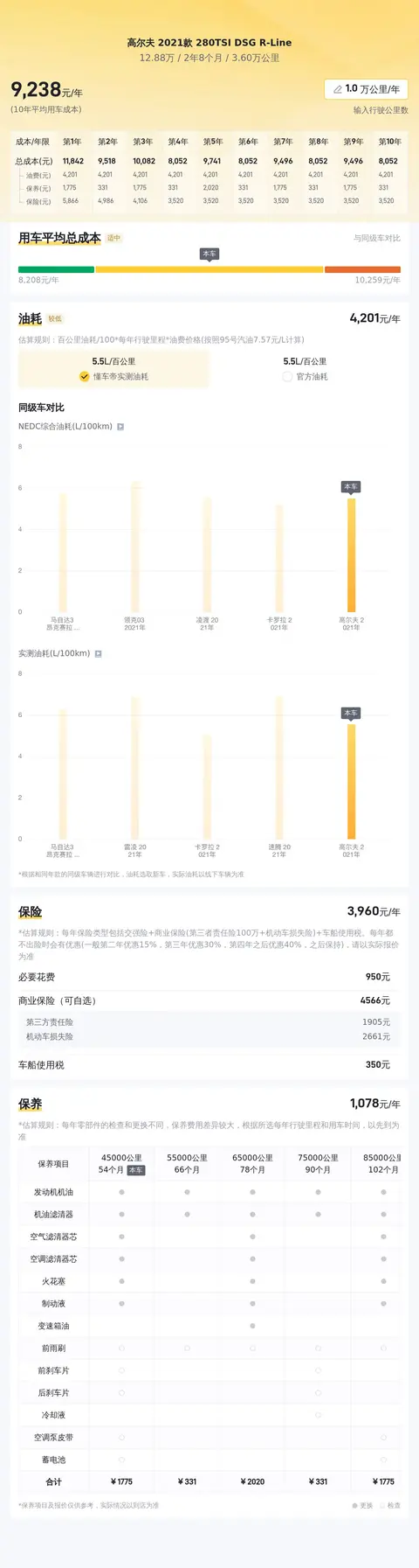 根据懂车帝大数据分析,该车的售价较为合理,是一个不错的选择。关于用车成本,该车的百公里油耗为5.5升,按照每年行驶一万公里计算,燃油费用约为4682元。保险方面,每年保费大约为3725元,包括交强险、商业险和车船使用税。保养方面,每年的保养费用大约为1418元。这些数据仅供参考,实际费用可能会因个人驾驶习惯和车况等因素而有所不同。但总体来说,这款车的使用成本相对较低,适合那些注重经济性和性价比的消费者。