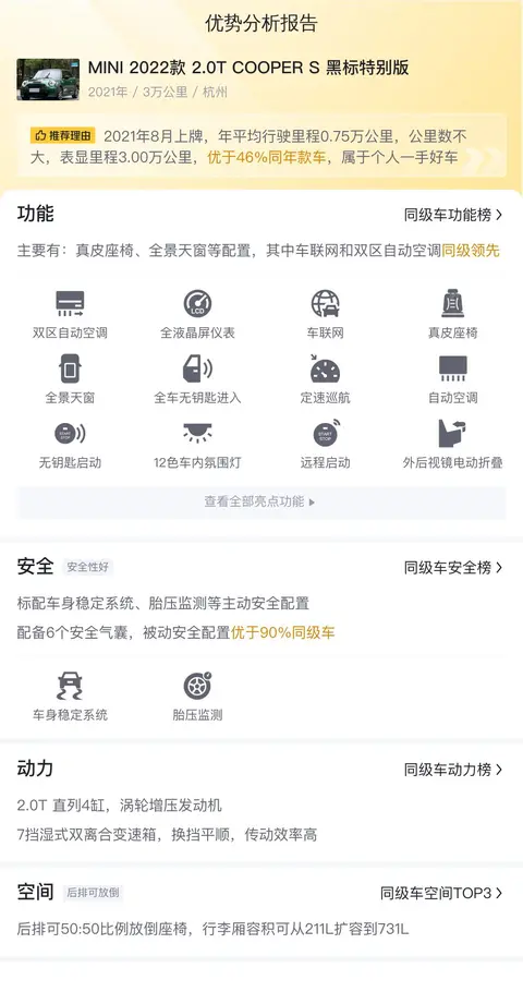 综上所述,这辆二手MINI 2022款 2.0T COOPER S 黑标特别版凭借其独特的外观设计、精致的内饰细节、出色的动力性能以及丰富的配置,在二手车市场上展现出了较强的竞争力。其个性鲜明的外观和内饰设计吸引了众多追求时尚与个性的消费者;而强劲的动力输出和精准的操控表现,则让驾驶变得更加轻松愉悦。同时,该车在安全配置方面也表现出色,为乘客提供了全方位的保护。然而,作为一款紧凑型掀背车,MINI的空间表现并不算宽敞。如果你经常需要携带多名乘客或大量行李出行,那么这款车可能无法完全满足你的需求。此外,虽然该车的年均综合用车成本相对较低,但仍然需要根据个人经济实力和用车频率来进行综合考虑。如果你不需要过于宽敞的空间,且经济实力允许你承担每年约1.2万元的用车成本,那么这辆二手MINI无疑是一个不错的选择。它能为你带来时尚个性的驾驶体验,并在日常使用中展现出较高的性价比。但如果你经常需要携带多名乘客或大量行李出行,或者希望进一步降低用车成本,那么你可能需要考虑其他车型。总的来说,这辆二手MINI 2022款 2.0T COOPER S 黑标特别版是一款集个性、时尚与性能于一身的车型。它在多个方面都展现出了较强的实力,并能在日常使用中为消费者带来愉悦的驾驶体验。然而,是否选择这款车还需要根据个人的具体需求和情况进行综合考虑。希望本文能够为你提供有用的信息,帮助你在购车道路上做出明智的决策。