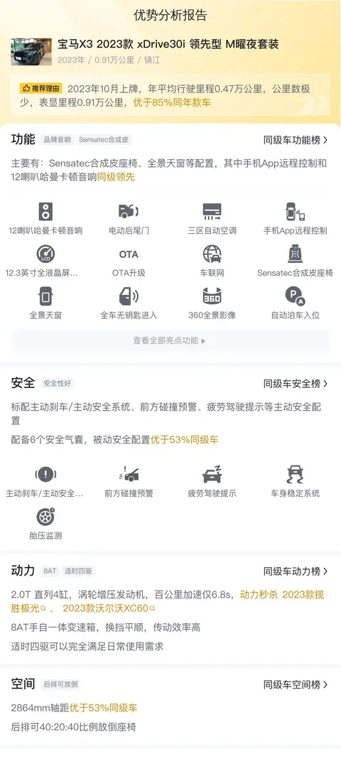 这辆宝马X3的车源地和上牌地都是镇江,2023年10月上牌,至今行驶了9.1万公里,有1次过户记录,黑色车身浅色内饰,有2级加价,目前二手车报价28.8万。