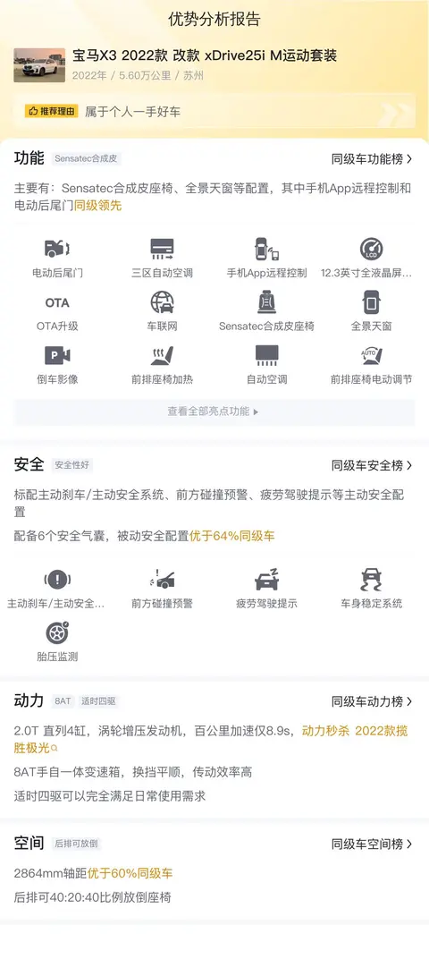 综上所述的新车含税价、用车成本、市场行情、优势分析、同款比价等数据仅供参考。在配置部分,因为二手车非标品,车辆可能会存在配置改装的情况,具体车况信息需要线下结合车辆实际情况进行综合参考。