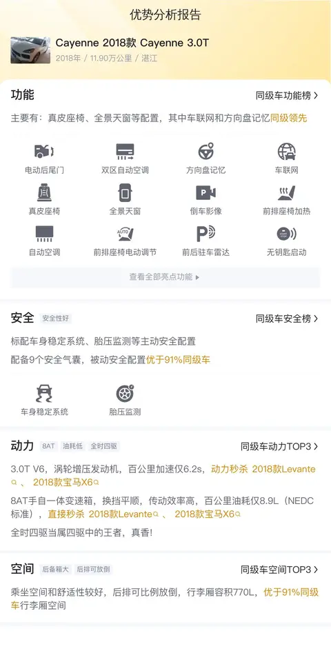 Cayenne 2018款 Cayenne 3.0T的市场行情价是40.81万- 48.87万,它的报价则是35.38万,低于市场行情,加上它的保值率高于同级车,所以性价比很高。