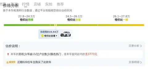 当前这款车的市场行情价在24.97万-30.53万之间,具体的价格因车辆的车况而有所不同,而咱们这辆车的售价为24.64万,车况正常情况下,价格低于市场行情的最低价格,说明价格非常有优势。