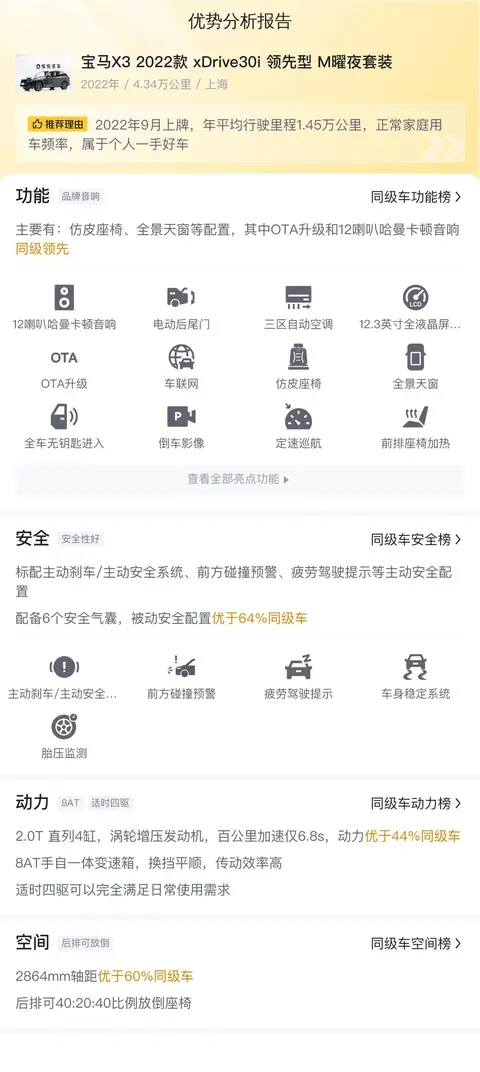 综上所述,这辆二手宝马X3 2022款 xDrive30i 领先型 M曜夜套装在车况、配置、性能、用车成本等方面均表现出色,是一辆值得考虑的二手车选择。然而,在购买二手车时,消费者还需注意以下几点:首先,要仔细检查车辆的外观和内饰,确保没有重大事故或维修痕迹;其次,要了解车辆的保养记录和维修历史,避免购买到问题车辆;再次,要试驾车辆,感受其操控性能和舒适性是否符合个人需求;最后,要比较市场价格,确保购买价格合理。只有综合考虑这些因素,才能购买到一辆性价比高、车况良好的二手车。