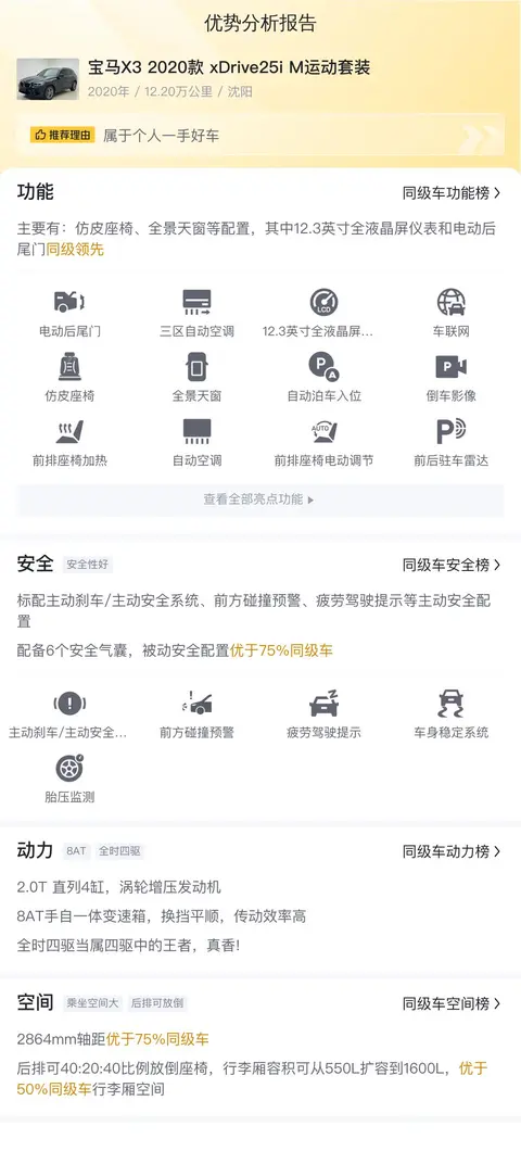 总的来说,这辆宝马X3 2020款 xDrive25i M运动套装以其卓越的性能、精致的工艺和合理的价格(16.67万元),成为了一款极具吸引力的二手车选择。它不仅拥有强大的动力和出色的操控性,还提供了宽敞舒适的空间和丰富的智能配置。经过全面的车况检查,确保了其品质可靠。如果您正在寻找一款性价比高的中型SUV,这辆宝马X3无疑是一个值得考虑的选项。