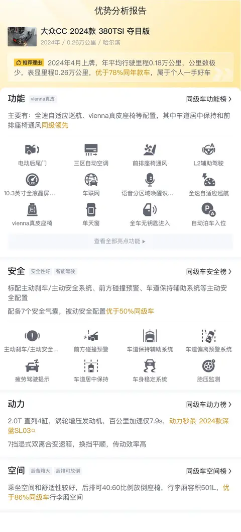优点:车子比较新,基本是准新车,动力强劲,配置丰富,座椅通风,自动驾驶辅助系统都有,价格相对来说也实惠,保值率比较高。