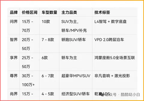 - 问界:主打15万-70万区间,以SUV为主,还补充了轿车和MPV,核心卖点是L4智驾和数字底盘