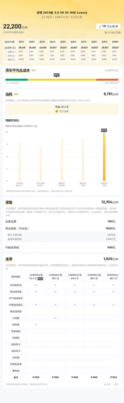 接下来,我们估测一下这辆二手路虎发现的用车成本。根据估算,这辆车的年均综合用车成本大约在每年2.2万元左右。这里要说的是,实际费用支出可能会因不同车主的使用习惯和用车环境等因素有所差异。